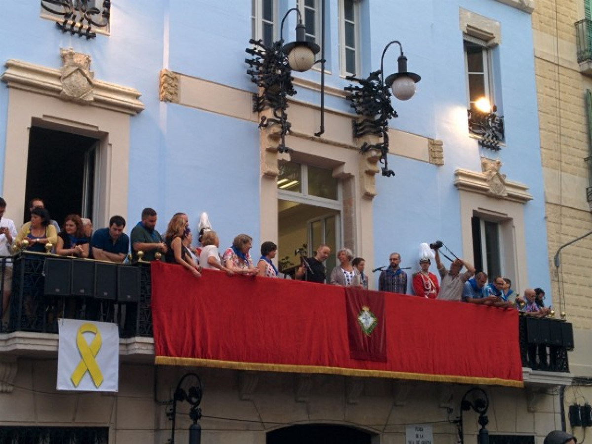 Durant la lectura del pregó, Elena Carreras ha enviat un "abraçada molt forta a les preses polítiques", mentre la plaça estallava en crits de "llibertat presos polítics".