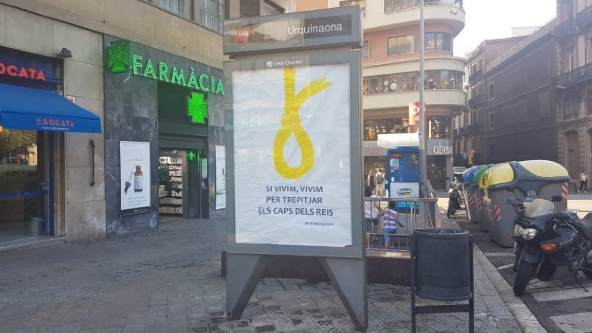 Una marquesina de la plaça Urquinaona de Barcelona de matinada amb una cartell en què es pot observar un llaç groc a manera de soga amb una frase de l'obra 'Enric IV' de William Shakespeare en la qual es llegeix: 'Si vivim, vivim per trepitjar els caps dels reis '.