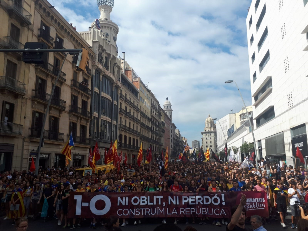 Sota el lema 'Ni oblit, ni perdó. Construïm la república', la manifestació ha partit passades les 12.20 hores de la plaça Universitat amb lemes com 'Els carrers seran sempre nostres', 'Llibertat presos polítics' i '1 d'octubre, ni oblit ni perdó'.