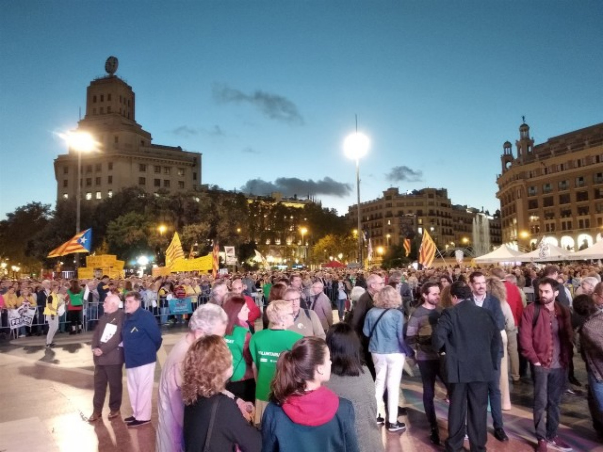 Centenars de ciutadans s'han concentrat aquest dimarts a la tarda a la plaça Catalunya de Barcelona per participar en l'acte de protesta d'ANC i Òmnium Cultural pel primer any de presó de Jordi Cuixart i Jordi Sànchez.