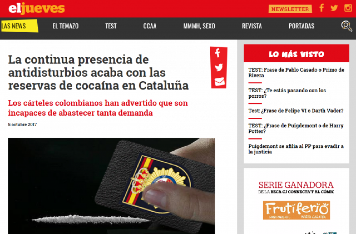 La Fiscalia de Barcelona ha demanat arxivar la causa contra els responsables d' 'El Jueves' per un presumpte delicte d'injúries contra els policies del dispositiu Copèrnic per impedir l'1-O en publicar articles satírics en què afirmava que van acabar 'amb les reserves de cocaïna de Catalunya ', perquè el contingut "no sobrepassa l'àmbit de la més pura ficció", segons l'escrit.
