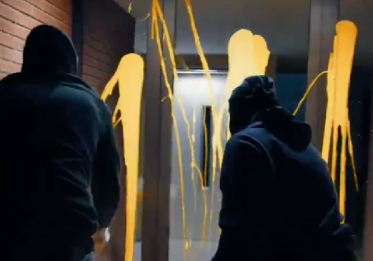Al vídeo, l'organització juvenil revela la direcció de Llarena i mostra com dos encaputxats llancen pintura groga a les portes del domicili a Sant Cugat.