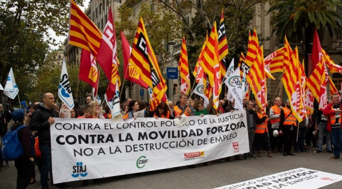 A la manifestació a Barcelona, els manifestants han protestat sota la pancarta amb els missatges: 'Contra el control polític de la justícia, contra la mobilitat forçosa, no a la destrucció d'ocupació'.