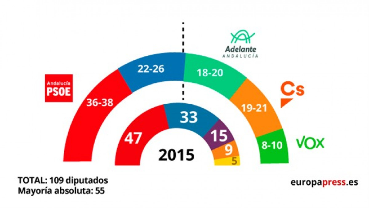 El PSOE ha tornat a guanyar les eleccions autonòmiques celebrades en el dia d'avui a Andalusia, encara que amb un fort descens en escons, situant-se entre 36-38, enfront dels 47 que va obtenir en els comicis de 2105, segons l'enquesta de GAD3 per ABC.