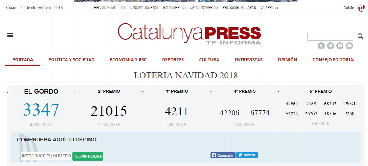 11.45, el segon i últim quart premi: 67.774, que a Catalunya ha tocat sobretot a Ripollet (Barcelona), i també en Franqueses del Vallès i l'Hospitalet de Llobregat (Barcelona), Cambrils (Tarragona) Balaguer (Lleida) i Lleida, entre altres localitats de Espanya, bastant repartit, dècim venut online.