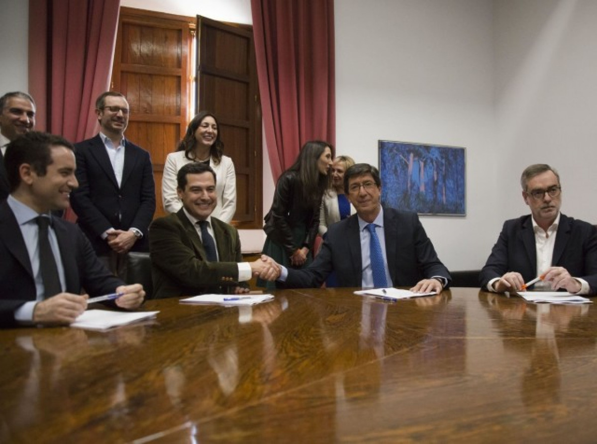 La comissió política encapçalada pels líders de PP-A i Ciutadans a Andalusia, Juanma Moreno i Juan Marín, respectivament, han signat aquest dimecres un acord polític pel qual la formació taronja dona suport al líder del PP-A com a president de la Junta, mentre que Moreno nomena Marín vicepresident del seu Executiu.