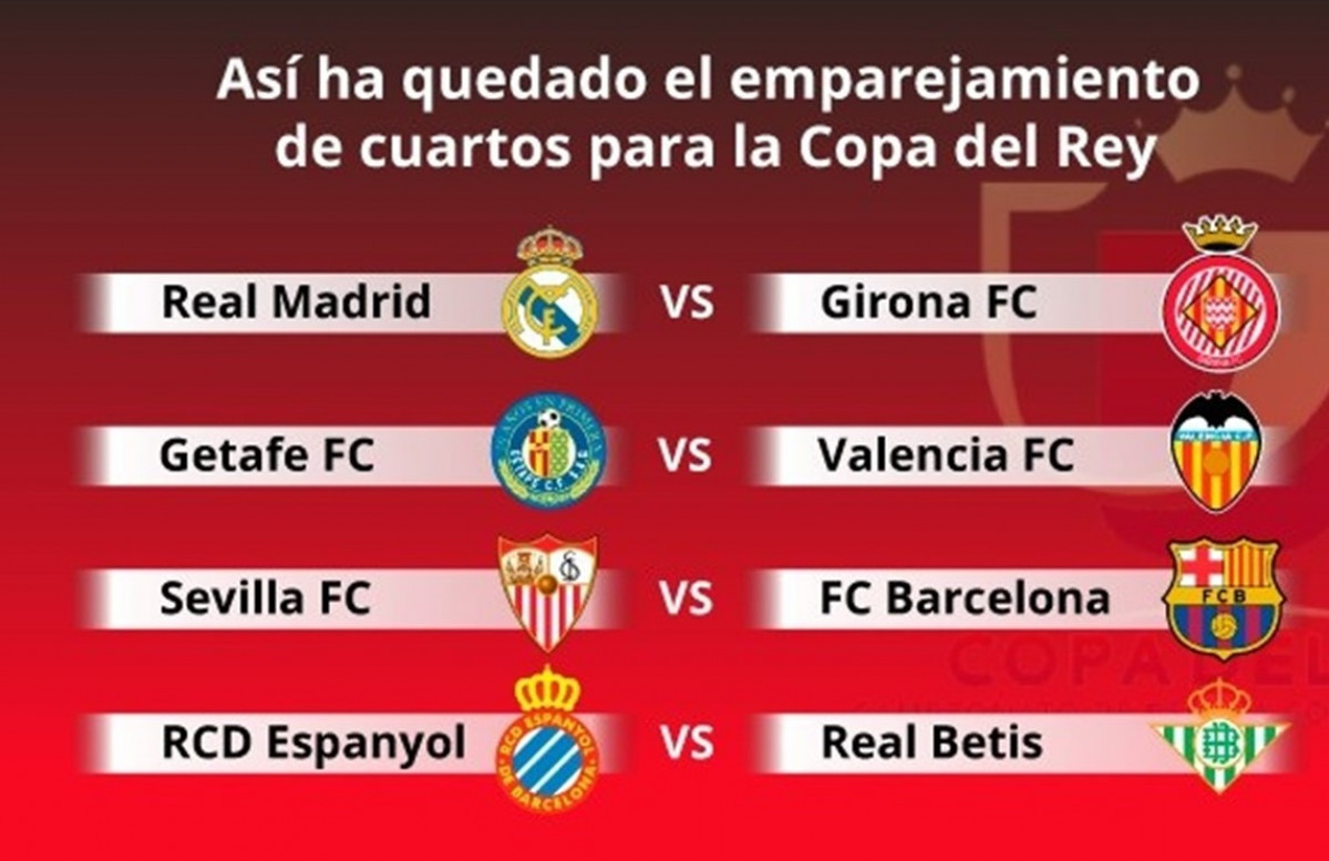 El sorteig de quarts de final de la Copa del Rei, celebrat aquest divendres a la Ciutat del Futbol de Las Rozas, ha ofert els emparellaments Sevilla-Barcelona, Reial Madrid-Girona, Getafe-València i Espanyol-Betis.