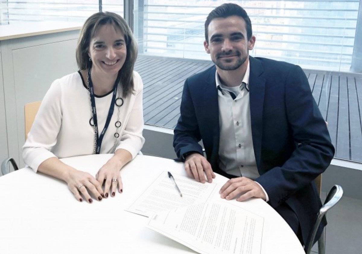 El director general i conseller delegat de Geprom Connecting Industries, Darío Cesena Forcada, i la directora d'empreses de Telefónica Espanya, María Luisa de Urquía, han signat l'acord entre les dues empreses.