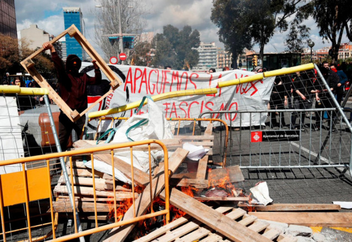 Una part dels activistes -alguns, encaputxats- han llançat objectes i han cremat contenidors i tanques, formant una foguera al carrer Tarragona (on Arran i els CDR havien convocat una protesta contra la manifestació del partit lideardo per Santiago Abascal), que està en un dels extrems de la plaça Espanya.