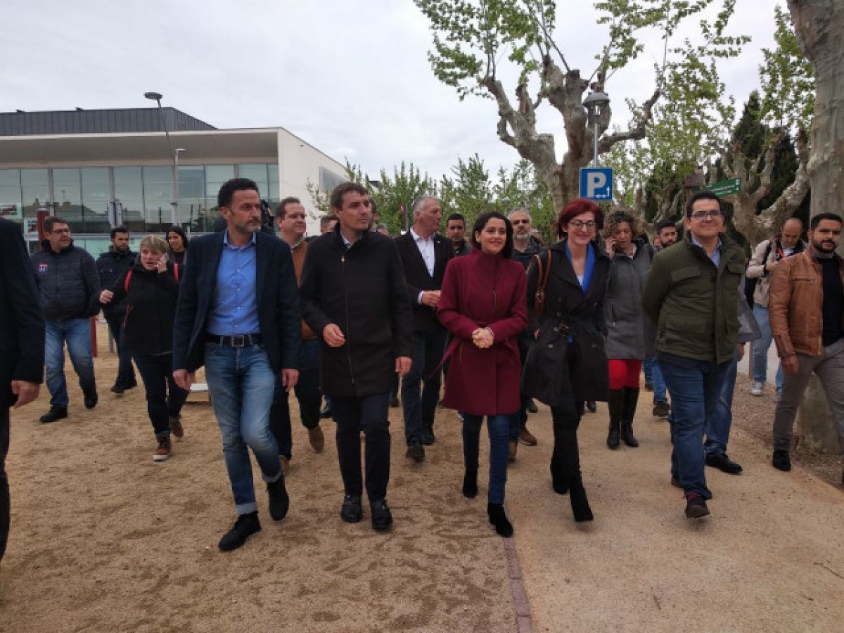 Inés Arrimadas i els diputat de Ciutadans que han visitat aquest dissabte Torroella de Montgrí han estat rebuts, per unes 50 persones, al crit de 'Fora feixistes', abanas de realitzar el míting de campaña.