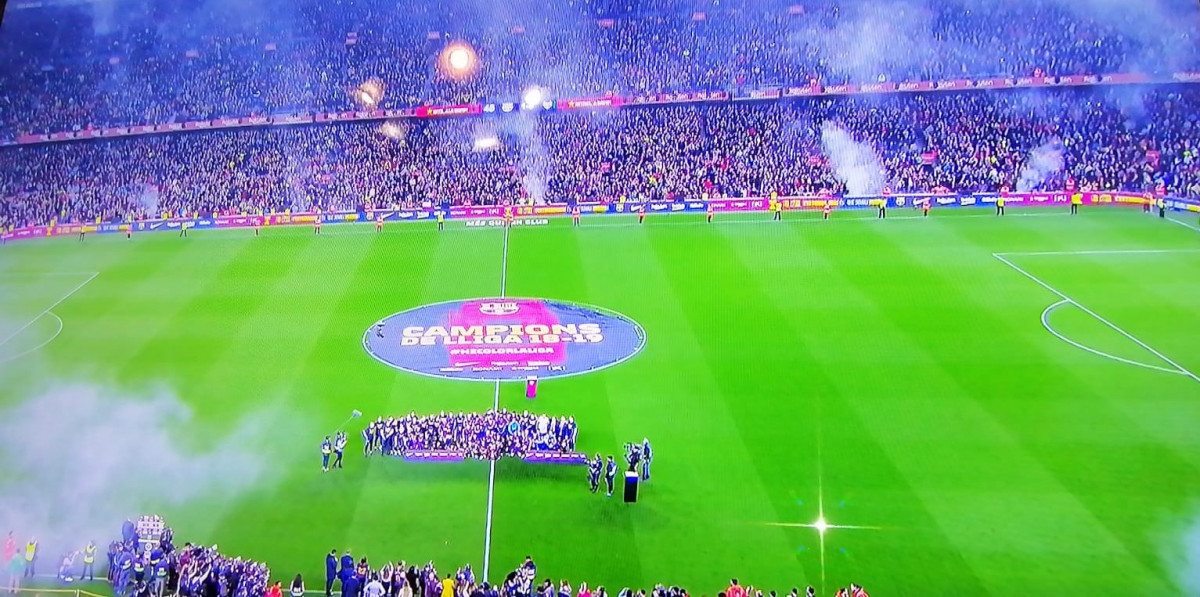 Al ritme de 'Campions, Campions' al Camp Nou va començar a celebrar el títol de lliga -tímidament- a pocs minuts del final del partit, ja que el resultat del partit, tot i el control evident del Barcelona, era de 1-0.