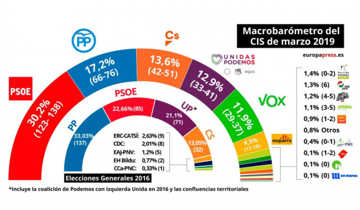 El CIS augurava un mal resultat per al PP, al qual atorgava un 17,2% dels vots i entre 66 i 76 diputats, com així ha quedat confirmat aquest diumenge, en què els de Pablo Casado han rebut el suport d'un 16,70% de l'electorat, el que es tradueix en 66 escons, 71 menys que en les eleccions generals de juny de 2016.
