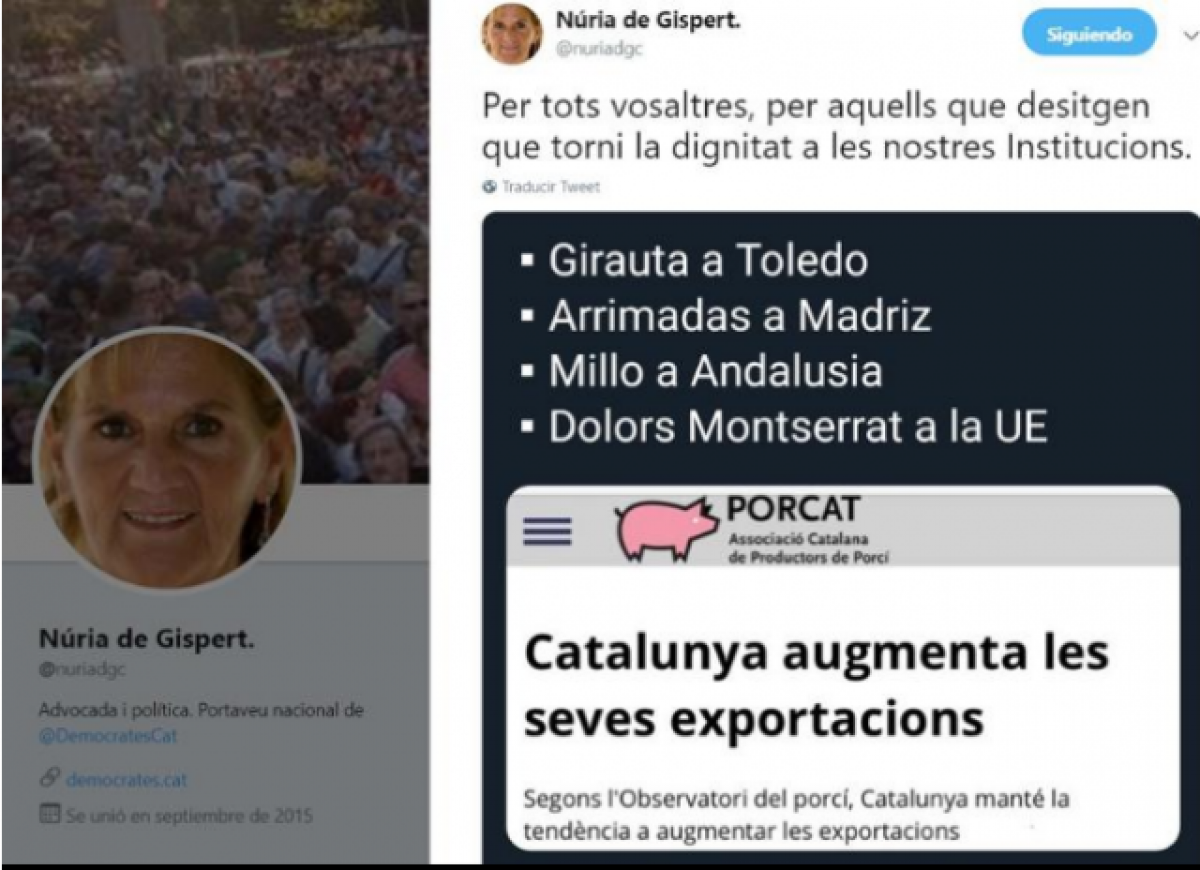 En el missatge, penjat en el seu perfil personal de Twitter, esmenta: 'Juan Carlos Girauta a Toledo, Inés Arrimadas a 'Madriz', Enric Millo a Andalusia i Dolors Montserrat a la UE' acompanyat d'una imatge de l'Associació Catalana de Productors de porcí (Porcat), que té un porc com a logo, amb el titular 'Catalunya augmenta les exportacions'.