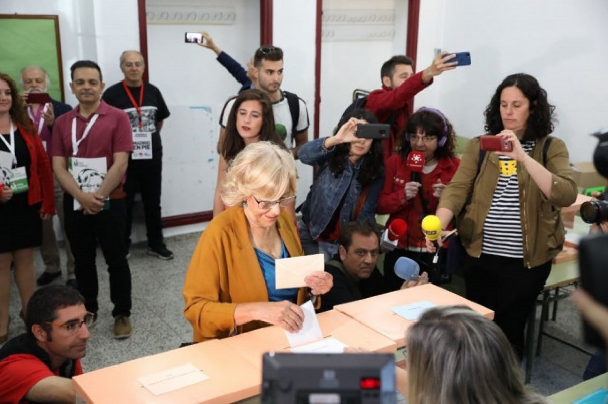 Carmena ha arribat caminant a l'IES Comte d'Orgaz cap a les 9.45 hores. Ho ha fet amb crits d'ànim perquè repeteixi com a alcaldessa. "Dona i gran, això és valor afegit", deia una votant.