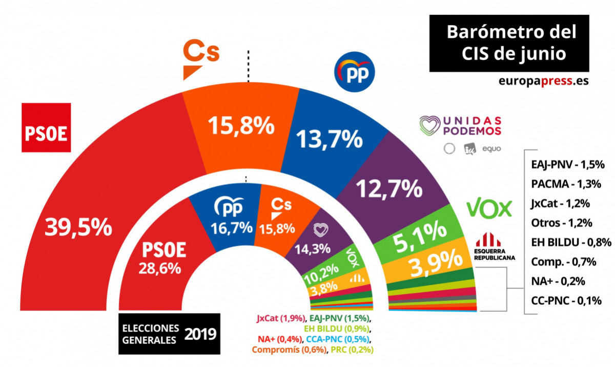 El Baròmetre d'Opinió del Centre d'Investigacions Sociològiques (CIS) corresponent al mes de juny situa el PSOE en el 39,5% de vot ja decidit, traient 23,7 punts al segon, que passa a ser Ciutadans per sobre del PP, i mentre baixa Unides Podem.