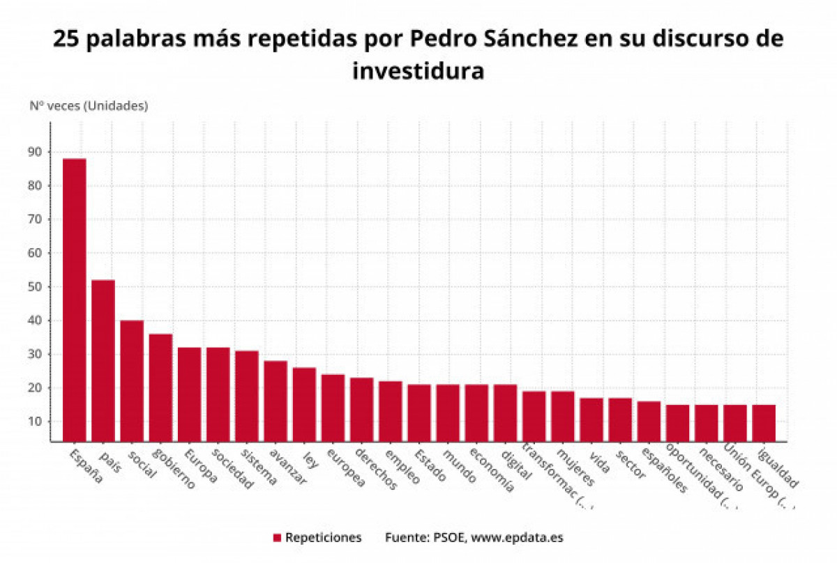 Espanya, país, govern, social o Europa són algunes de les paraules més repetides pel president en funcions i candidat a la investidura Pedro Sánchez durant la seva primera intervenció en el debat d'investidura.