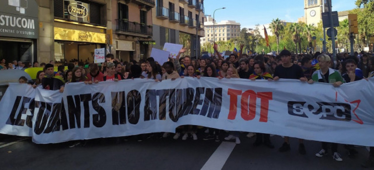Els estudiants han iniciat passades les 12 hores la marxa amb una pancarta que resa 'Per la república catalana', amb càntics a favor de la independència i en favor de la vaga general.