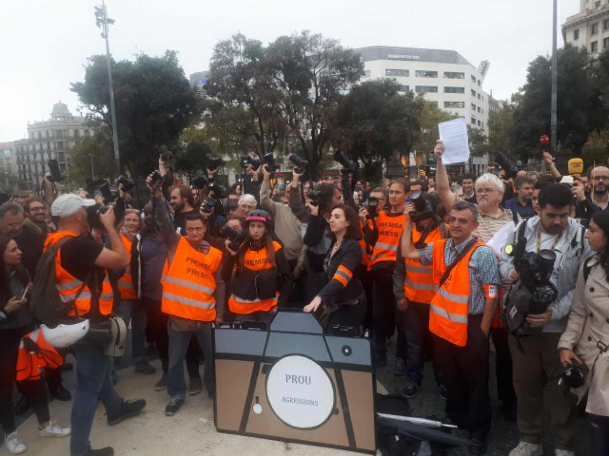 La concentració l'han convocat col·lectius i sindicats de periodistes, amb els fotoperiodistes en primera línia i una càmera de fotos en forma de pancarta amb el lema 'Prou agressions', i part dels professionals amb l'armilla i els braçalets taronges acreditatius.