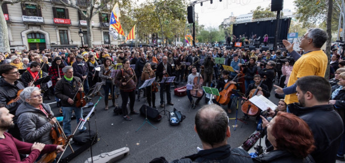 Al voltant de les 16.00 hores, un grup d'assistents ha penjat una bandera formada de 25 estelades, unides les unes amb les altres, a la façana de l'edifici històric de la Universitat de Barcelona (UB), i un cor i músics del col·lectiu Músics per la Llibertat que han acudit a la cita amb els seus instruments han interpretat 'El cant de la senyera', 'L'estaca', 'La santa espina' i 'Els segadors'.