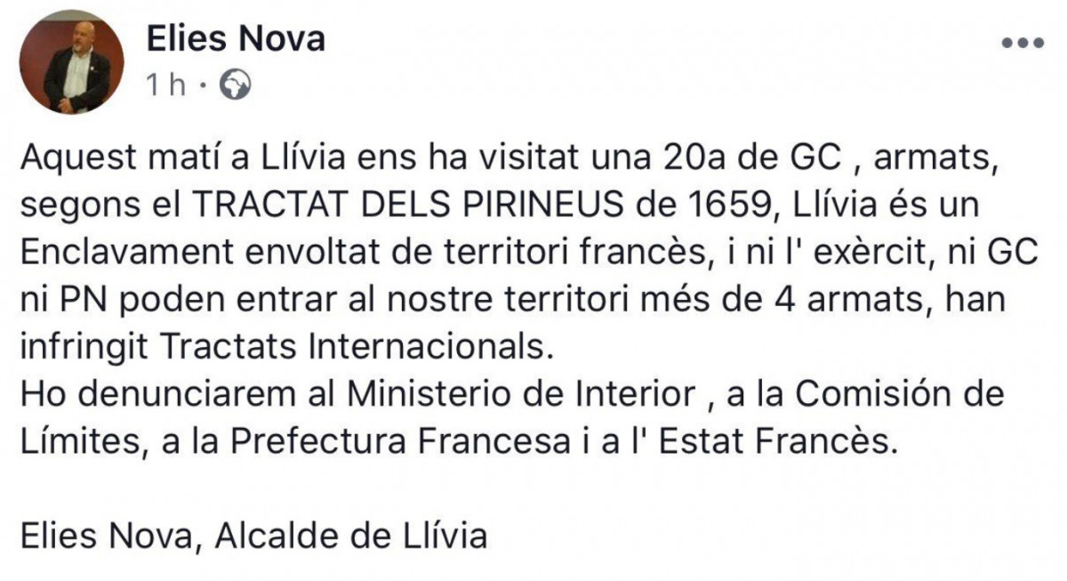 L’alcalde de Llívia, Elies Nova, ha denunciat al Twitter que una vintena d’agents armats de la Guàrdia Civil han entrat avui al municipi, coincidint amb la jornada electoral.