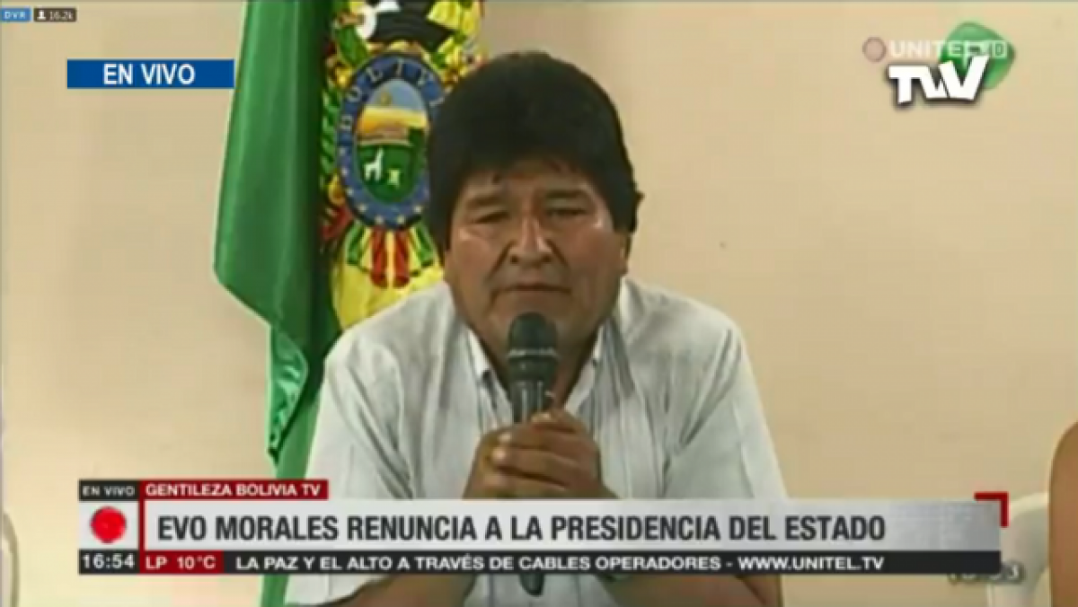 Evo Morales renuncia com a president de Bolívia després de la pressió exercida per les forces armades i la policia perquè dimitís -per les sospites de frau electoral a les eleccions del 20 d'octubre- i després de la renúncia de diversos dels seus ministres.