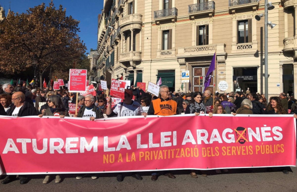 Unes 2.500 persones, segons la Guàrdia Urbana, s'han manifestat aquest diumenge al centre de Barcelona contra el Projecte de llei de contractes de serveis a les persones que prepara la Generalitat ('Llei Aragonès') al considerar que "privatitza serveis públics" externalitzant seva gestió cap a empreses privades no sotmeses a escrutini públic.