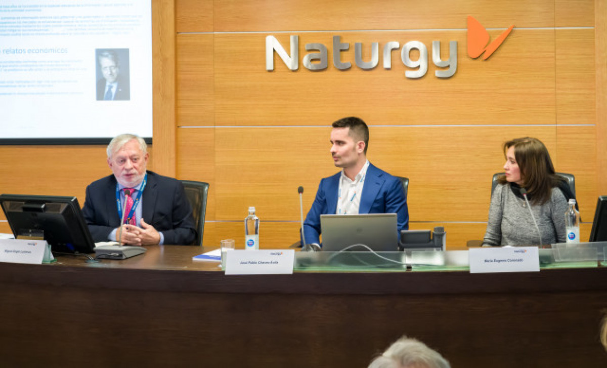 D'esquerra a dreta, l'economista expert en mercats d'energia Miguel Ángel Lasheras; l'investigador de l'Institut d'Investigació Tecnològica de l'Escola Tècnica Superior d'Enginyeria (ICAI) -Universitat Pontifícia Comillas, José Pablo Chaves-Àvila; i la directora general de la Fundació Naturgy, María Eugenia Coronat.