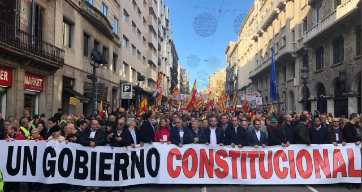 La manifestació ha començat a la plaça Urquinaona alguna cosa després de les 12, sota el lema 'Per un Govern constitucionalista' encapçalada per representants de Catalunya Suma, així com membres de l'PP i Vox, però no de Cs, que ha acudit i tenia previst fer declaracions però ha decidit anar-se'n abans de començar la manifestació, per la presència d'una pancarta que demanava la derogació de la Llei de Violència de Gènere.