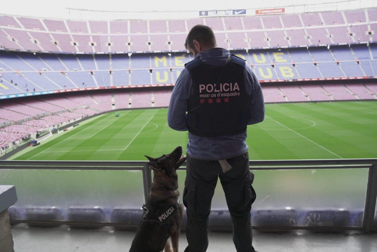Uns 1.000 mossos d'Esquadra i 2.000 efectius de seguretat privada del FC Barcelona es desplegaran aquest dimecres 18 de desembre per a garantir la seguretat de l'entorn del Camp Nou i de la celebració del Clàssic amb el Reial Madrid, un partit previst a les 20 hores, davant la convocatòria de Tsunami Democràtic sota el lema 'Drets, llibertat, autodeterminació'. A les 9.00 del matí, la unitat canina ja s'ha posat a treballar a l'entorn del Camp Nou.