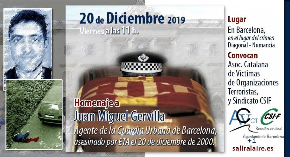 La Central Sindical Independent i de Funcionaris (CSIF) organitza el proper divendres 20 de desembre un acte commemoratiu en record del guardia urbà Juan Miguel Gervilla, assassinat per ETA el 20 de desembre de l'any 2000 a Barcelona. A l'acte assistiran Luis del Olmo -que era l'objectiu de la banda terrorista el dia que van assassinar Gervilla- i José Vargas, president de l'Associació de Víctimes del Terrorisme (ACVOT).