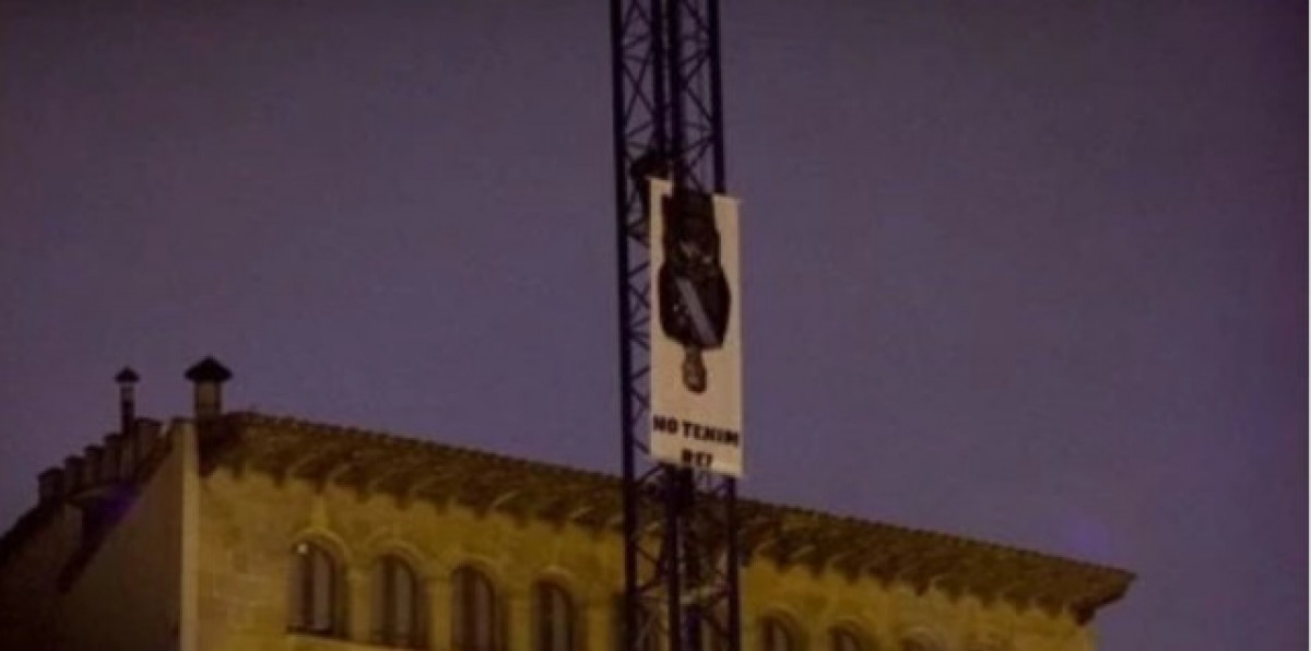 Al cartell, penjat en una grua, apareixia una foto de Rei Felipe VI cap per avall sobre fons blanc i es podia llegir 'No tenim rei'.