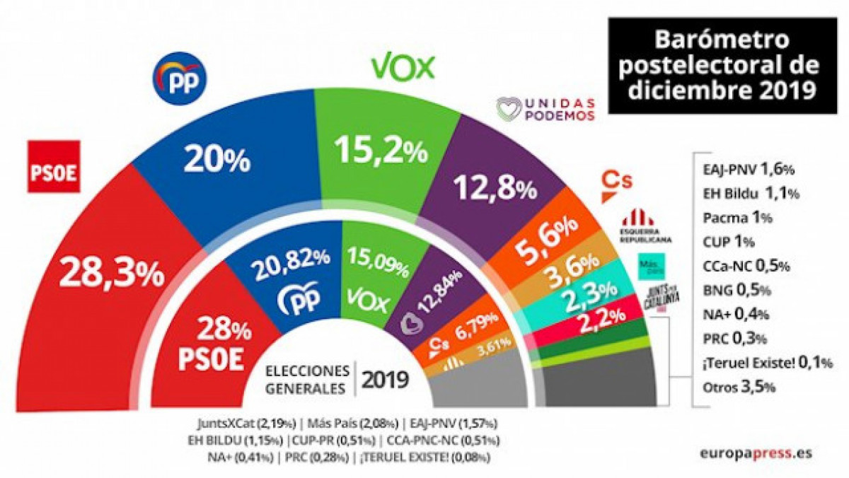 Així, el CIS de José Félix Tezanos -renovat en el seu càrrec aquest 15 de gener- atorga al PSOE una estimació de vot del 28,3%, tres dècimes més que el seu resultat del 10N, amb un avantatge de 8,3 punts respecte del PP, a què se li calcula un suport del 20%, vuit dècimes més que en les eleccions.