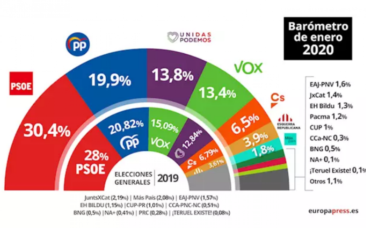 El Baròmetre d'Opinió del mes de gener fet públic pel Centre d'Investigacions Sociològiques (CIS) manté al PSOE al capdavant, amb una estimació de vot del 30,4%, dos punts més que el mes anterior, cosa que li fa ampliar a 10 punts el seu avantatge respecte al PP, que figura com a segon amb un suport del 19,9%.