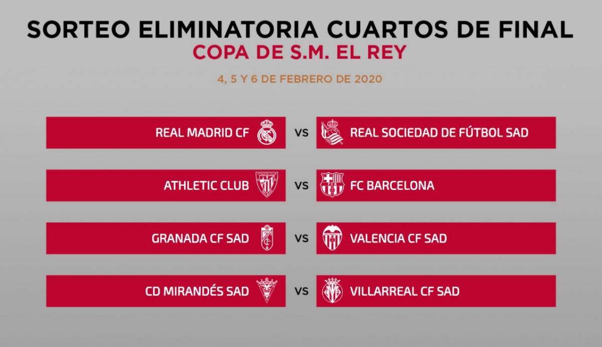 El Barça s'enfrontarà a l'Athletic Club en els quarts de final de la Copa del Rei, en partit únic que es disputarà a Bilbao. El sorteig d'aquest divendres 31 al migdia també ha aparellat el Reial Madrid amb la Reial Societat, el Granada amb el València i el Mirandés amb el Vila-Real.