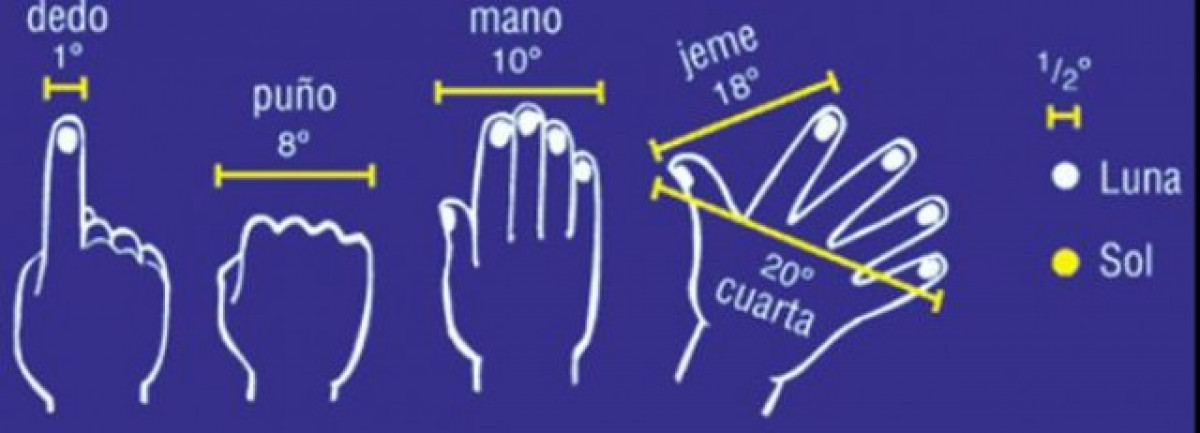 El cel és una esfera per tant les mesures de distàncies entre estrelles es mesuren en graus, la nostra mà ens pot dir aquestes distàncies. Estenem el braç cap al cel i podem mesurar així: