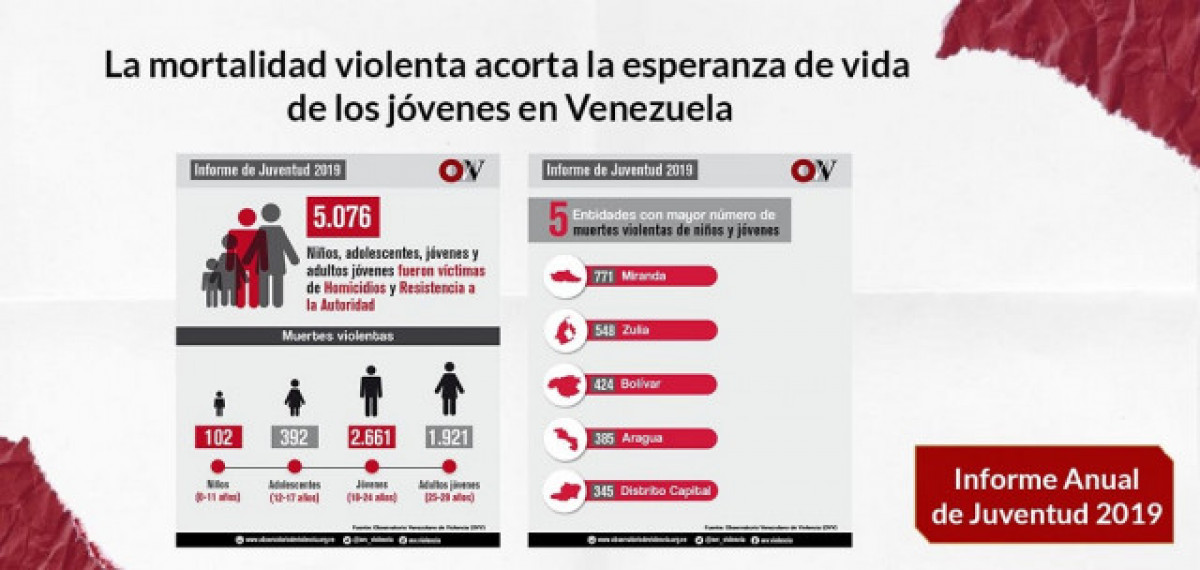 En 2019 van ser assassinats a Veneçuela almenys 5.076 nens, adolescents i joves menors de 30 anys. L'informe de l'Observatori Veneçolà de la Violència (OVH), publicat el 18 de febrer, inclou a les víctimes d'homicidis i episodis de resistència a les autoritats policials o militars.