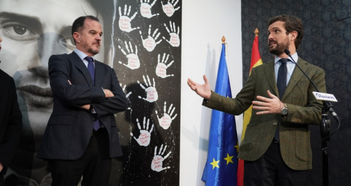 El líder popular Casado ha visitat aquest divendres la localitat biscaïna d'Ermua, acompanyat del candidat a lehendakari de PP + Cs, Carlos Iturgaiz, i la presidenta interina dels populars bascos, Amaya Fernández, per mantenir una trobada amb afiliats i càrrecs de la formació.