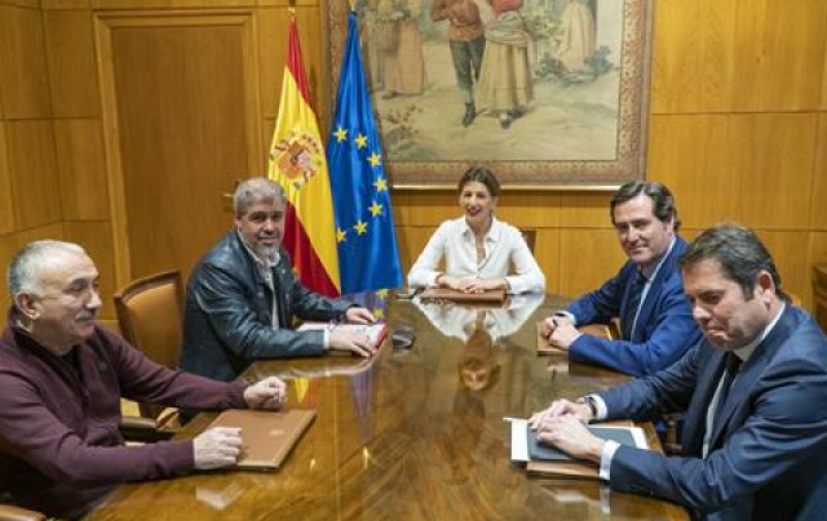 La ministra de Treball i Economia Social, Yolanda Díaz; els secretaris generals d'UGT i CCOO, Pepe Álvarez i Unai Sordo; el president de la CEOE, Antonio Garamendi, i el president de Cepime, Gerardo Cuerva, han pactar el preacord.