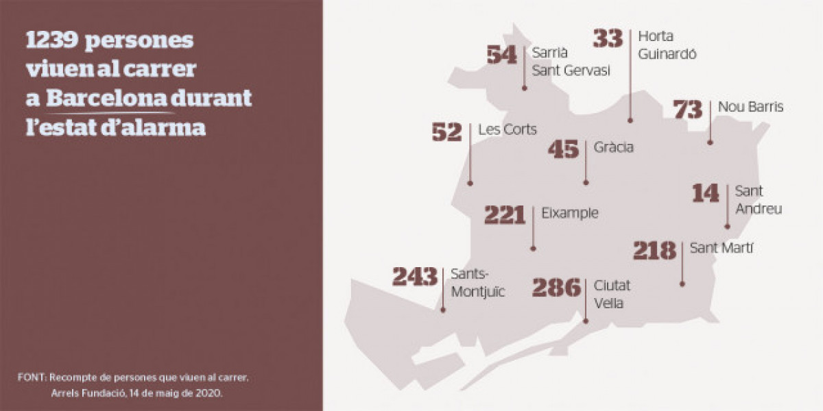 La Fundació Arrels ha xifrat en 1.239 les persones que, segons el recompte fet per l'ONG la nit del 14 de maig, dormen als carrers de Barcelona i, en el context de l'estat d'alarma per coronavirus, no poden confinar. En concret, Ciutat Vella, Sants-Montjuïc, l'Eixample i Sant Martí acumulen el 79% de les persones localitzades.