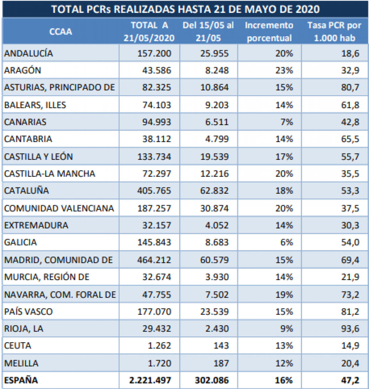 En concret, ha destacat que, fins al 20 de maig, s'han realitzat 2.221.497 test de diagnòstic PCR, excloent els test d'anticossos.