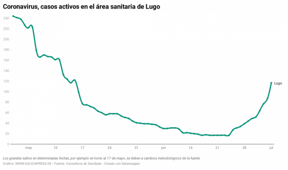 Les últimes xifres de SERGAS parlen de 106 casos en el rebrot d'A Mariña. Set ja s'han curat, de manera que el rebrot té ara 99 casos actius. A la província de Lugo hi ha 117 casos actius.