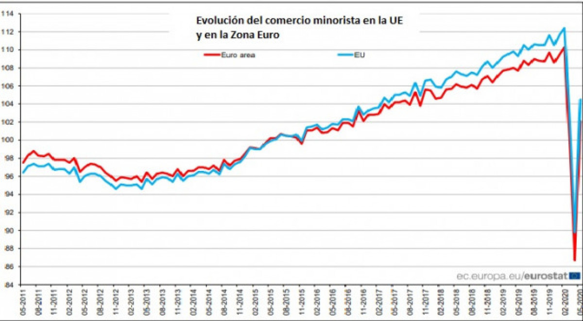 El comerç minorista es torna a recuperar a Europa després de dos mesos de caigudes consecutives a causa de la crisi del Covid-19. Al maig, el volum de negoci generat pel comerç al detall va créixer un 16,4% a la Unió Europea (UE), i un 17,8% a la zona euro, segons les dades publicades per Eurostat .