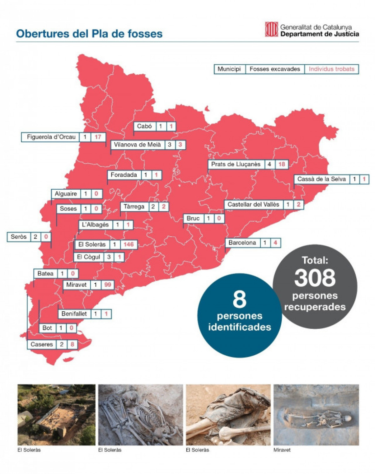 La Conselleria de Justícia de la Generalitat ha explicat en un comunicat aquest dijous que en les excavacions a Catalunya durant els últims tres anys també s'han recuperat els cadàvers de 308 persones mortes en el conflicte.