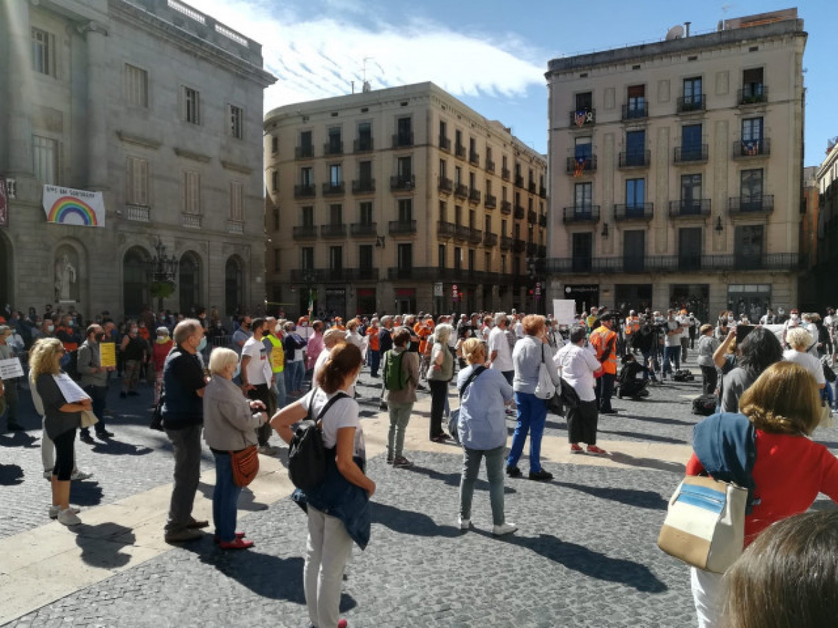 La Coordinadora Residències 5 + 1 s'ha concentrat aquest dissabte al migdia a la plaça Sant Jaume de Barcelona per reclamar un canvi de model residencial i per alertar del nombre de morts en residències durant la pandèmia del coronavirus.