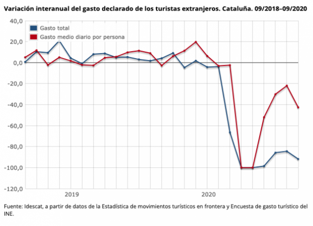 A Catalunya, la despesa total dels turistes residents a l'estranger es va situar en 186 milions d'euros al setembre de 2020, el que suposa una disminució de el 91,8% respecte al mateix període de l'any anterior, segons dades de l'Idescat.