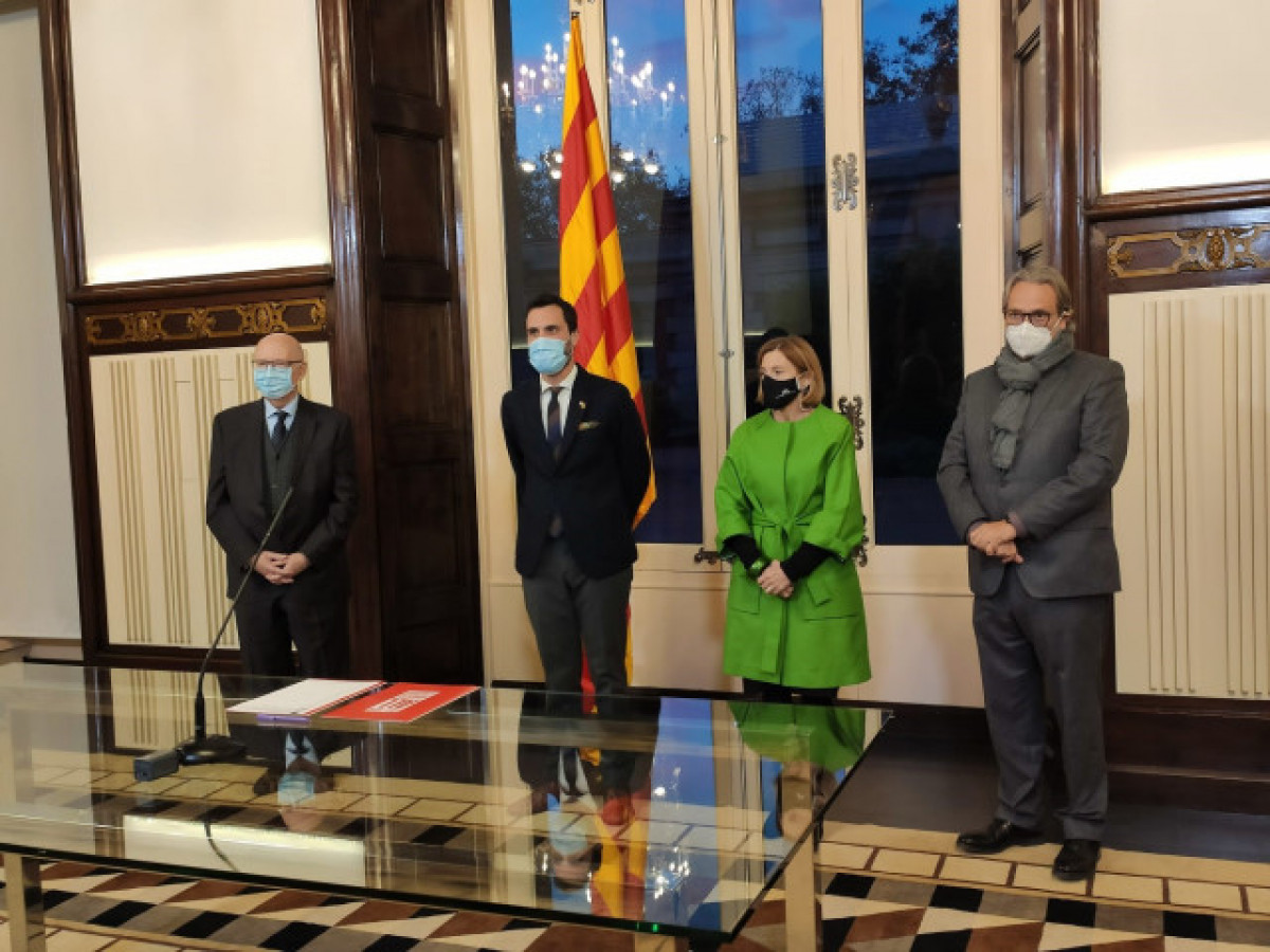 El president de Parlament, Roger Torrent, i els expresidents de la Cambra Carme Forcadell, Ernest Benach i Joan Rigol han signat aquest dimarts la petició per tramitar una llei d'amnistia al Congrés per als presos de l'1-O i de totes les persones encausades pel procés independentista.