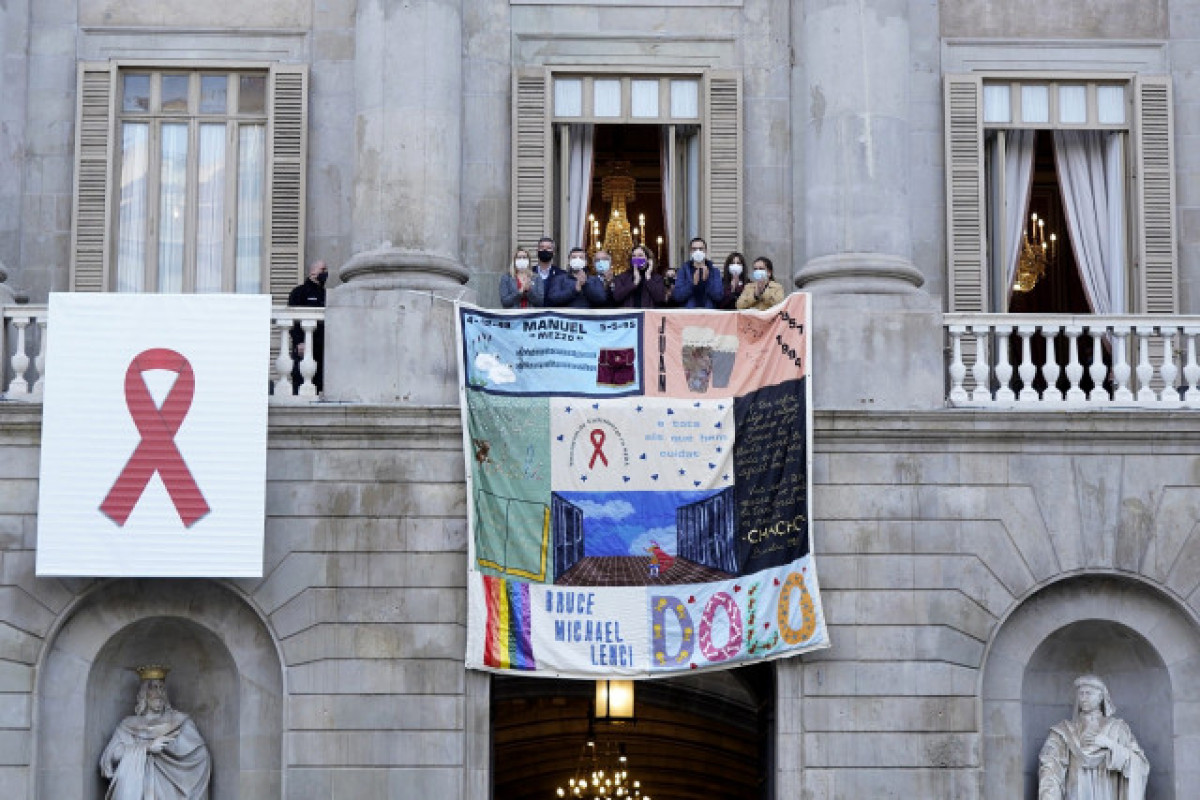 Barcelona homenatja les víctimes de sida amb un tapís memorial a la façana de l'Ajuntament