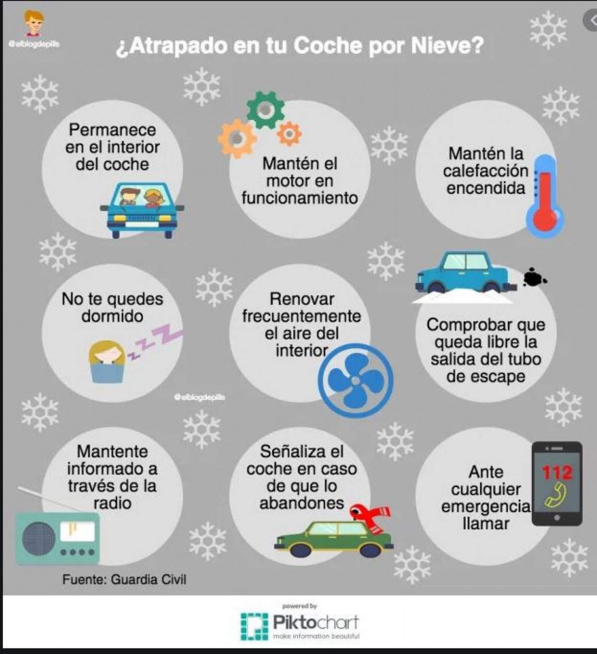 A més, cal tenir la precaució d'omplir el dipòsit de la gasolina i portar pneumàtics d'hivern o cadenes; portar roba d'abric i un telèfon mòbil amb bateria de recanvi i / o carregador d'automòbil; si està atrapat a la neu, s'aconsella romandre al cotxe, amb la calefacció posada, renovant cada cert temps l'aire, i vigilar que el tub d'escapament no estigui obstruït per evitar que els gasos penetrin a l'interior de vehicle.