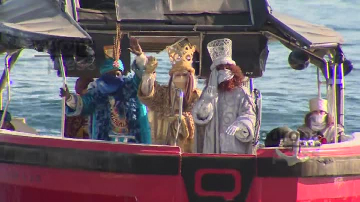 Els Reis Mags han recorregut el front litoral de Barcelona amb llanxa a la seva arribada a la ciutat aquest dimarts, abans de pujar al pailebot Santa Eulàlia, que els portarà a el port de al Fòrum.