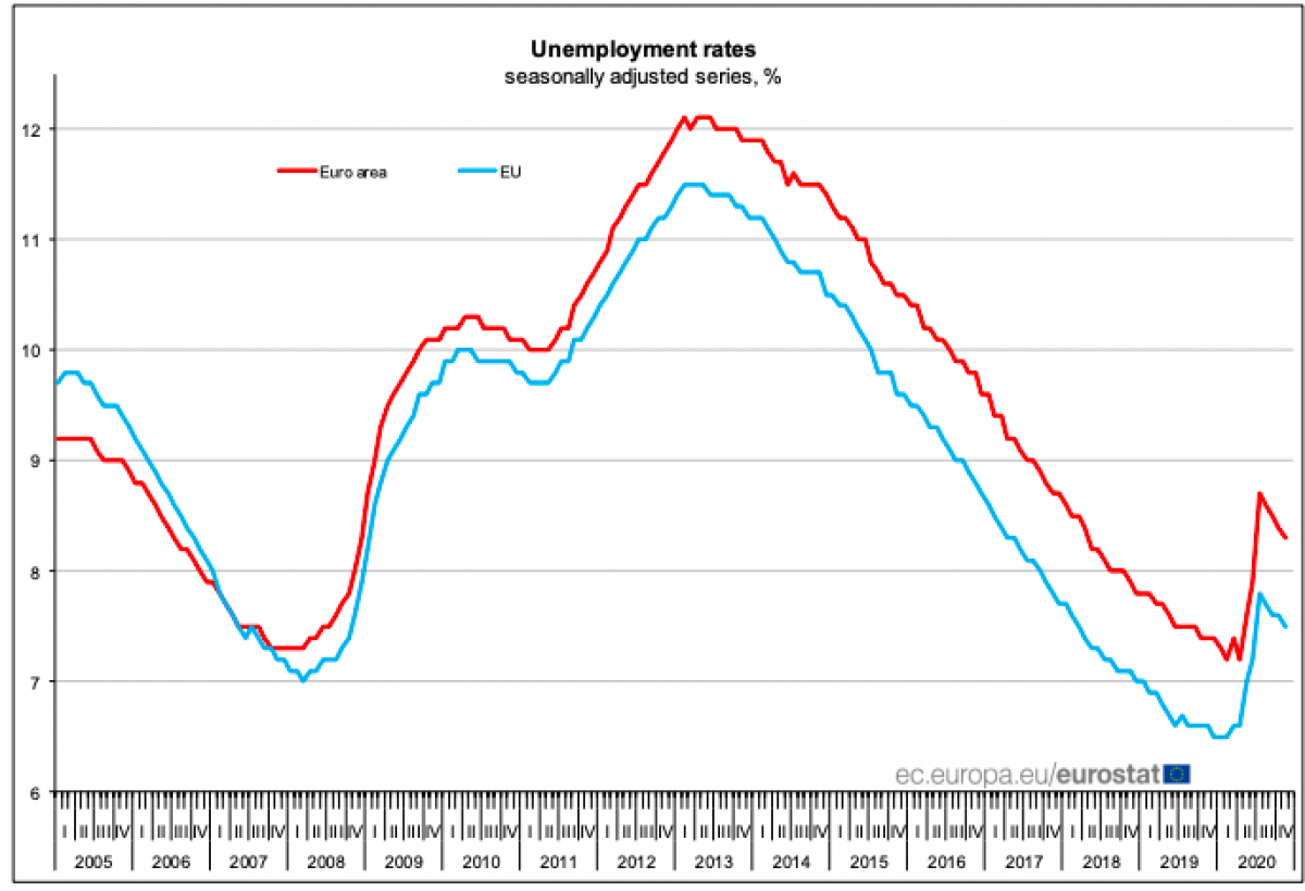 Al novembre de 2020, la taxa d'atur desestacionalitzada de la zona euro era del 8,3%, enfront del 8,4% d'octubre de 2020 i superior al 7,4% de novembre de 2019. La taxa d'atur de la UE era del 7,5% al novembre de 2020, davant el 7,6% de l'octubre de 2020 i des del 6,6% de novembre de 2019, segons l'Eurostat, l'oficina d'estadística de la Unió Europea.